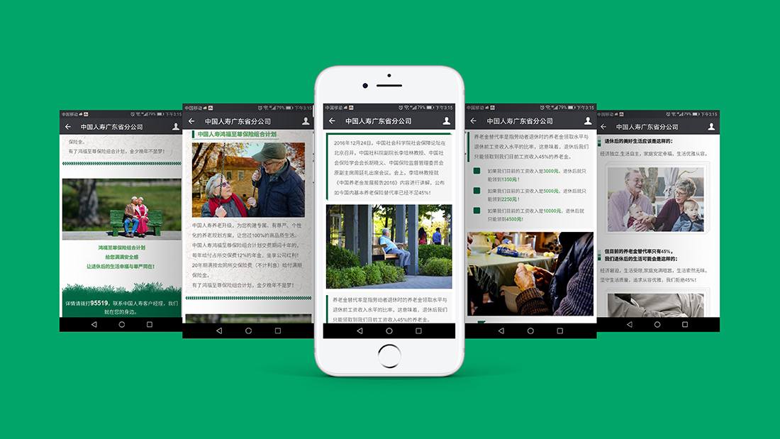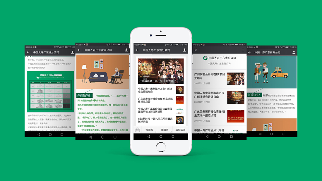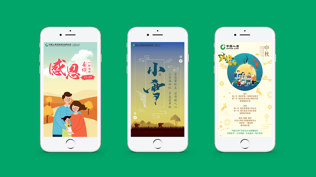 致杰品牌团队与中国人寿广东省分公司达成合作,为其提供官方微信运营的支持,其中包括品牌培训、官微推文排版标准规划、地域特色文化类原创推文撰写、理赔案件伪原创类推文改写、推文排版设计、宣传海报设计、H5制作等等服务。